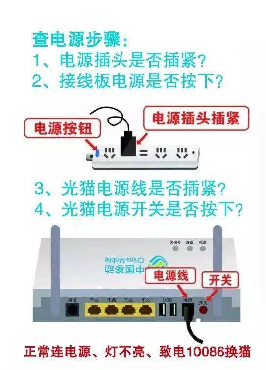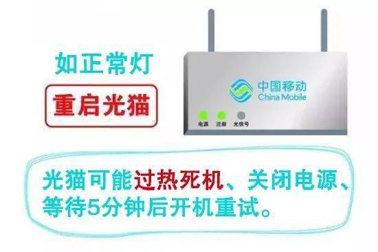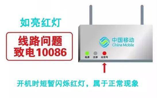 如果光猫“光信号”闪红灯,请插紧进户光纤头,并将过度弯曲的线缆重新整理,不能折弯。如果重启后红灯还不熄灭,烦请拨打10086或光猫服务卡上的联系电话进行报修,工作人员将会及时为您处理。