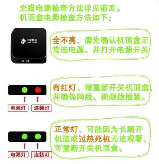 查看机顶盒是否亮绿灯。机顶盒第一个电源灯为红灯,表明机顶盒待机,可按遥控器待机/开机键恢复。(待机/开机键一般为遥控器最上面的红色按键)